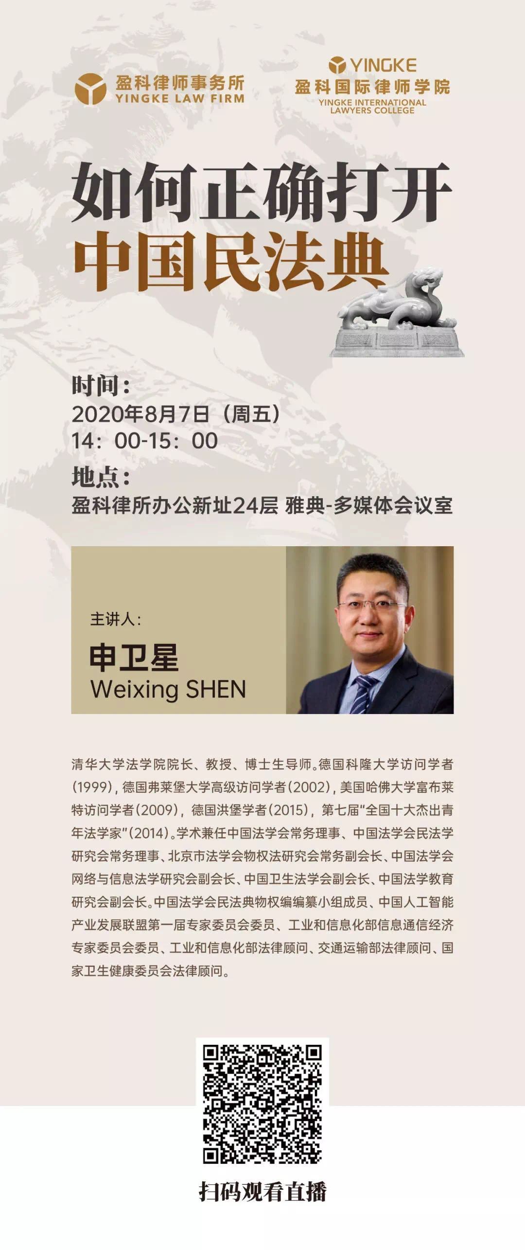 On August 7, 2020, Professor Weixing Shen, Dean of Tsinghua University Law School, and his colleague visited Beijing Yingke Law Firm and held a lecture in the Athens multimedia conference room of CP center.