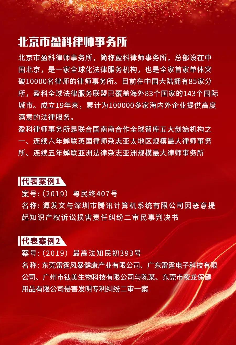 Nearly 300 agencies and teams participated in the selection. Based on the judgments and rulings of intellectual property cases concluded from January 1, 2019 to December 31, 2019, nearly 200,000 judicial documents were extracted. Finally, from the perspective of highlighting the comprehensive strength and professional characteristics of intellectual property litigation agency / team, 9 professional general lists and 8 laws were selected Professional list of division team. Among them, Yingke Law Firm was listed in the top 10 list of intellectual property litigation agencies in China in 2019-2020.